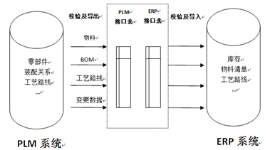 蘭石集團PLM系(xi)統(tong)與(yu)ERP系(xi)統(tong)集成的(de)主要(yao)任務是將(jiang)PLM系(xi)統(tong)中(zhong)生產相關的(de)零部件、BOM關系(xi)、工藝信息等導(dao)入(ru)ERP系(xi)統(tong)。集成過程并不采用直(zhi)接將(jiang)數據(ju)導(dao)入(ru)ERP的(de)方式,而是借用中(zhong)間數據(ju)庫,先將(jiang)PLM的(de)數據(ju)導(dao)入(ru)中(zhong)間數據(ju)庫對應接口表(biao),再由ERP系(xi)統(tong)從接口表(biao)讀取數據(ju),以確保(bao)系(xi)統(tong)的(de)穩定,同(tong)時,PLM創建相應接口表(biao),保(bao)存歷史(shi)數據(ju)。