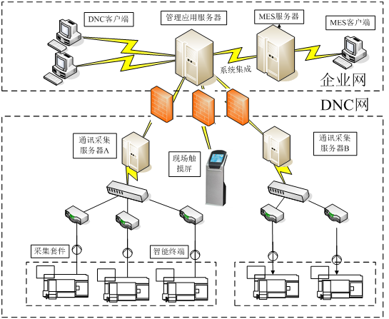 在(zai)企業局域(yu)網的架構下,數(shu)據(ju)文(wen)檔數(shu)據(ju)服務器(qi)、通訊管理客戶(hu)端、工(gong)藝室客戶(hu)端、數(shu)控機床等通過企業局域(yu)網相聯。