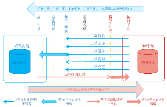 MES與ERP兩個系統(tong)的(de)集(ji)成(cheng)數(shu)據(ju)(ju)(ju)是(shi)雙向傳遞的(de),ERP系統(tong)傳遞給MES數(shu)據(ju)(ju)(ju)包括(kuo)工單(dan)信息、工單(dan)工序(xu)、工單(dan)變更(geng)、工單(dan)組件和工單(dan)資源,MES系統(tong)反(fan)饋給ERP的(de)數(shu)據(ju)(ju)(ju)為工序(xu)移動匯(hui)總信息。集(ji)成(cheng)數(shu)據(ju)(ju)(ju)傳遞采用中間表(biao)的(de)形式,MES和ERP系統(tong)將需要傳遞的(de)數(shu)據(ju)(ju)(ju)寫(xie)入對方(fang)的(de)中間表(biao),MES和ERP系統(tong)通(tong)過定時或手(shou)動提取中間表(biao)的(de)數(shu)據(ju)(ju)(ju)實(shi)現集(ji)成(cheng)。