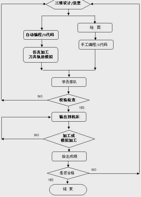 首先,學員在教師的指導下進行手工編程或自動編程,然后學員對自己編寫的程序在計算機上仿真模擬、確認無誤后,向主機申請排隊,按照先后順序,經教師檢查并通過后,輸出到對應的數控機床進行實際加工或模擬加工,待加工完成后,教師按照學生完成的先后順序、加工質量的優劣給學員評定成績,最后打印輸出或存檔。