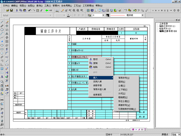 1)方便的交互式工藝設計:采用“所見即所得”界面,利用信息模型驅動的機制,實現數據與文檔的一體化。用戶面對真實的卡片界面進行信息錄入,通過卡片書進行任意頁的切換,可以根據需要在任意位置增加所需的卡片。系統提供豐富的工藝編輯功能,可以方便實現工序的調整順序、添加、刪除、移動、拷貝等編輯操作;并且提供工序、工步信息的列屬性編輯、塊選擇等,更加快捷方便。