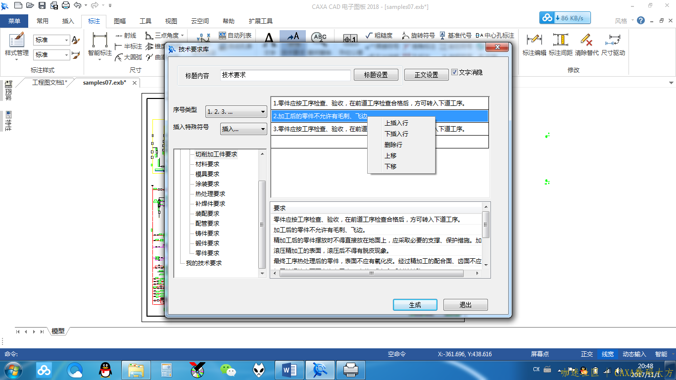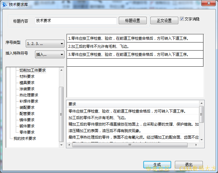 電子圖板技術要求庫提供了豐富的常用技術要求,在下方雙擊鼠標左鍵即可添加到上方編輯欄。序號的類型支持1.2.3、*、無序號等三種方式。在上方編輯欄的任意一行處按鼠標右鍵,可以進行行的上移、下移、刪除等操作。 |