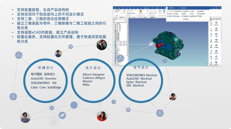 協(xie)同(tong)設(she)計平臺,對產品(pin)整(zheng)個(ge)生命周期全面(mian)管理(li),包括產品(pin)設(she)計、研發、制造、售后服務等(deng),實(shi)(shi)現各環(huan)節無縫銜接和信息(xi)共享,基于知識和規則(ze)研發創新,實(shi)(shi)現機電液(ye)軟(ruan)一(yi)體化并行設(she)計,多專業高(gao)效協(xie)同(tong)。