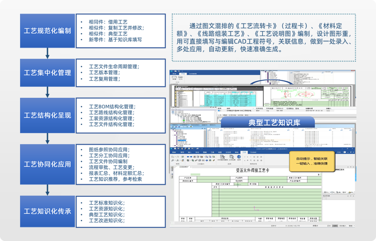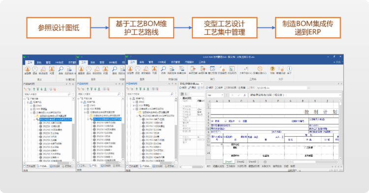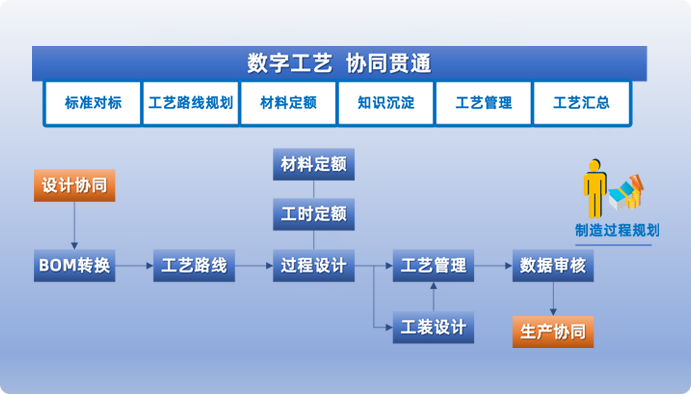 將工藝設計數據結(jie)構化處理(li),能夠更有效地指導實際生(sheng)產,快速生(sheng)成工藝方(fang)案,進行(xing)工藝分(fen)析和(he)優化;提供準確的(de)生(sheng)產工藝數據和(he)工時預估,標準化管理(li)制造工藝,實現各環節間的(de)信息共享和(he)協同。