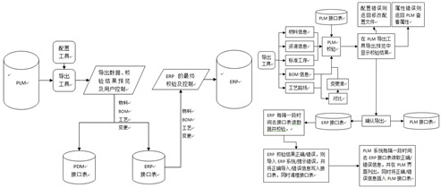 | 導出數據、校驗結果預覽及用戶控制 | 按接口表預覽導出信息,并顯示PLM對導出數據校驗的結果,由用戶控制是否導出。確認導出后,本次物料、資源、BOM、工藝信息會分別導入PLM接口表及ERP接口表,同時與PLM接口表中歷史導出的信息對比,有變更的BOM及工藝將額外產生變更單導入ERP接口表。導入成功后,PLM給出成功提示。 |