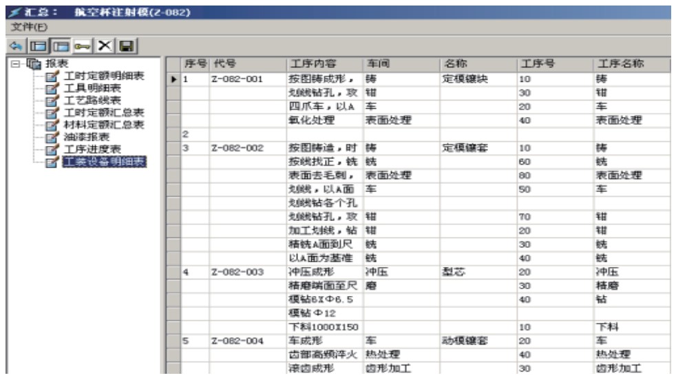 工藝匯(hui)(hui)(hui)(hui)總(zong)表(biao)模塊提(ti)供強大的(de)報表(biao)定制功能,可根(gen)據用戶需求(qiu)(qiu)定制、匯(hui)(hui)(hui)(hui)總(zong)報表(biao)的(de)內(nei)容和要求(qiu)(qiu),如按分(fen)廠、按產品匯(hui)(hui)(hui)(hui)總(zong)材(cai)料(liao)消(xiao)耗,工時定額,外(wai)購件外(wai)協件明細,工裝刀具(ju)明細等。匯(hui)(hui)(hui)(hui)總(zong)結果(guo)的(de)輸(shu)出支持多種格式,如xls、xlsx、xlsm、cxp、xml。